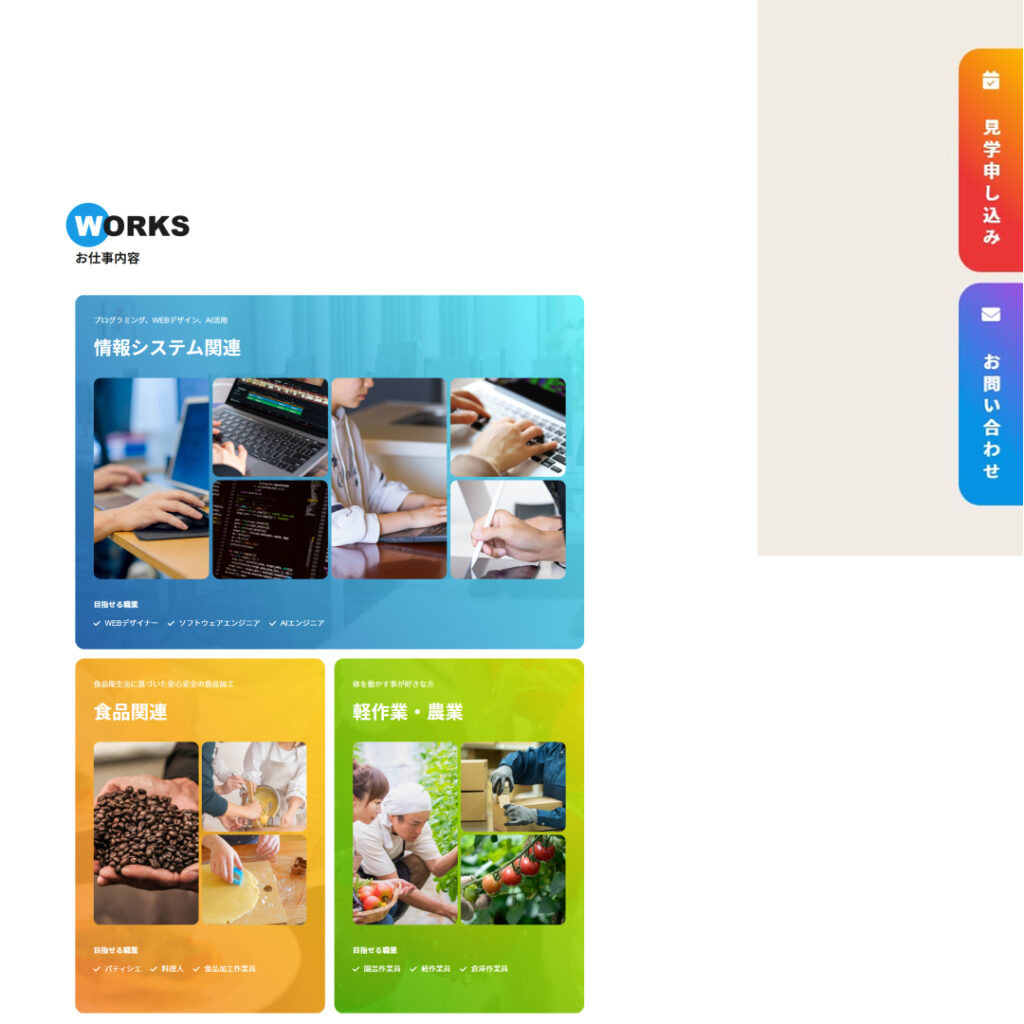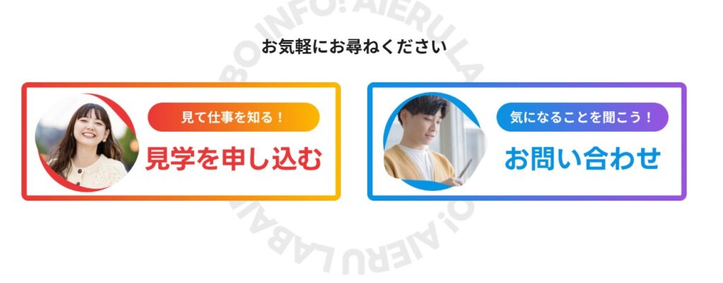 問い合わせボタンにも画像を使うことで、ユーザーが事業所で働く将来の自分自身をイメージしてもらえる様にし、「見て仕事を知る!」や「気になることを聞こう!」というような少し崩した言葉遣いを選び、問い合わせまでのハードルを下げるように工夫を行いました。